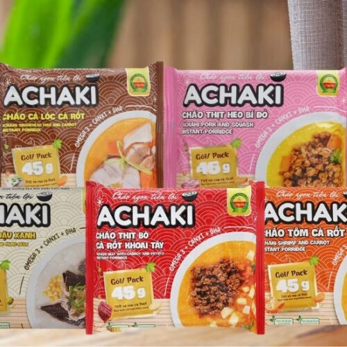 Rau ngót, cá hồi, bí đỏ, cà rốt, thịt heo, đậu xanh,… đều là nguyên liệu được dùng để sản xuất cháo ăn liền Achaki. Đặc biệt, sản phẩm có kèm cả rau củ tươi và thịt thật bên trong. Tất cả những nguyên liệu này đều tươi ngon, có nguồn gốc rõ ràng và trải qua quá trình chế biến đạt chuẩn quốc tế.