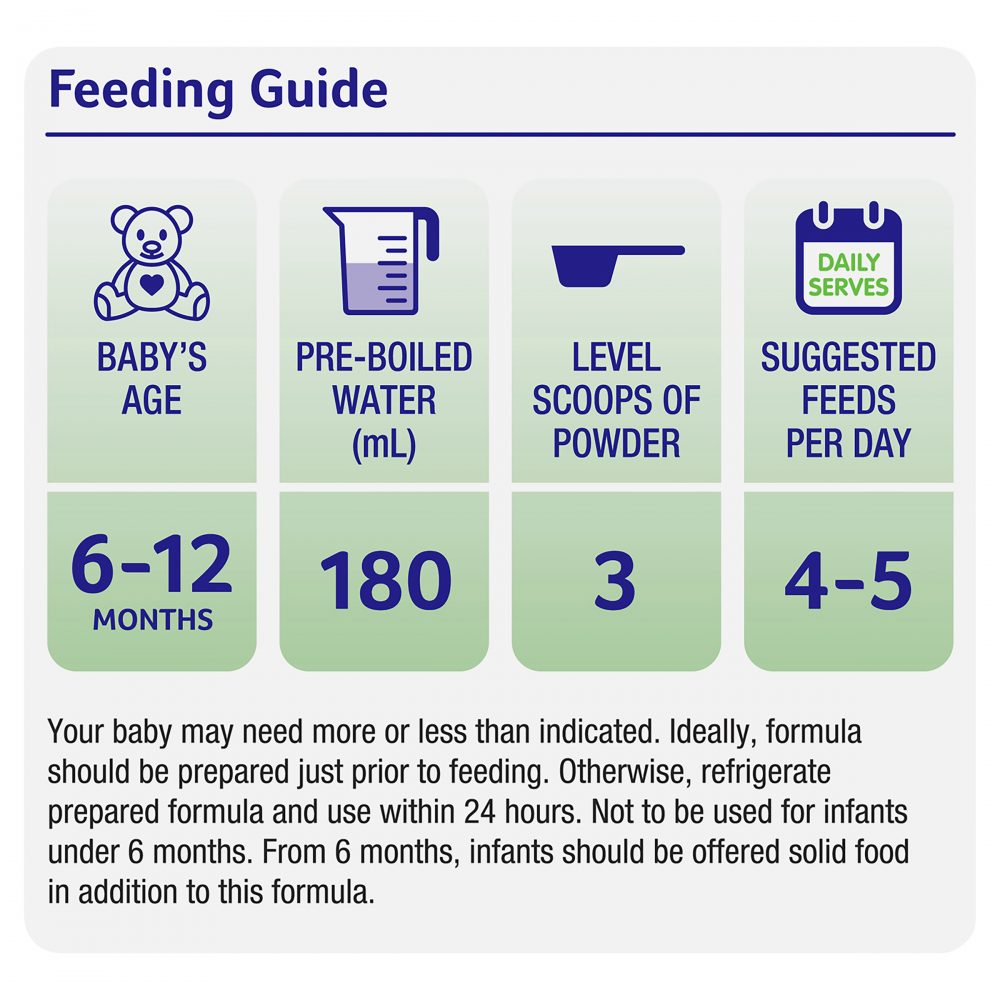 Số lượng trung bình trên 100mL sữa đã được pha(13,0g + 90mL nước) Năng lượng 273 KJ Đạm 1,30 g 50% Whey 0,65 g 50% Casein 0,65 g Chất béo 3,49 g Sn-2 Palmitate 0,32 g Omega 3 DHA 12 mg Axit α-Linolenic (ALA) 58 mg Omega 6 AA 12 mg Axit Linoleic (LA) 552 mg Carbohydrate 7,19 g Vitamin Vitamin A 61,5 µg Vitamin B1 51 µg Vitamin B2 173 µg Vitamin B6 40 µg Vitamin B12 0,25 µg Vitamin C 8,5 mg Vitamin D 1,25 µg Vitamin E 0,67 mg Vitamin K 3,4 µg Biotin 1,5 µg Folate 10 µg Niacin 400 µg Axit Pantothenic 350 µg Khoáng chất Canxi 76 mg Clorua 68 mg Đồng 60 µg Iốt 13 µg Sắt 1,2 µg Magiê 8,5 mg Mangan 35 µg Phốt pho 51 mg Kali 98 mg Selen 1,8 µg Natri 32 mg Kẽm 0,42 mg Cholin 10 mg Inositol 4,5 mg Lutein 9,6 µg Nucleotide 2,6 mg Taurine 4,7 mg