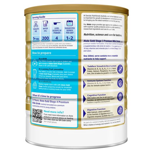 - Mô tả: Alula Gold Stage 3 là công thức cao cấp dành cho trẻ trên 1 tuổi. Với công thức bổ sung cho trẻ trong độ tuổi này, Alula cung cấp 16 loại vitamin và khoáng chất quan trọng cùng với Omega DHA và lutein