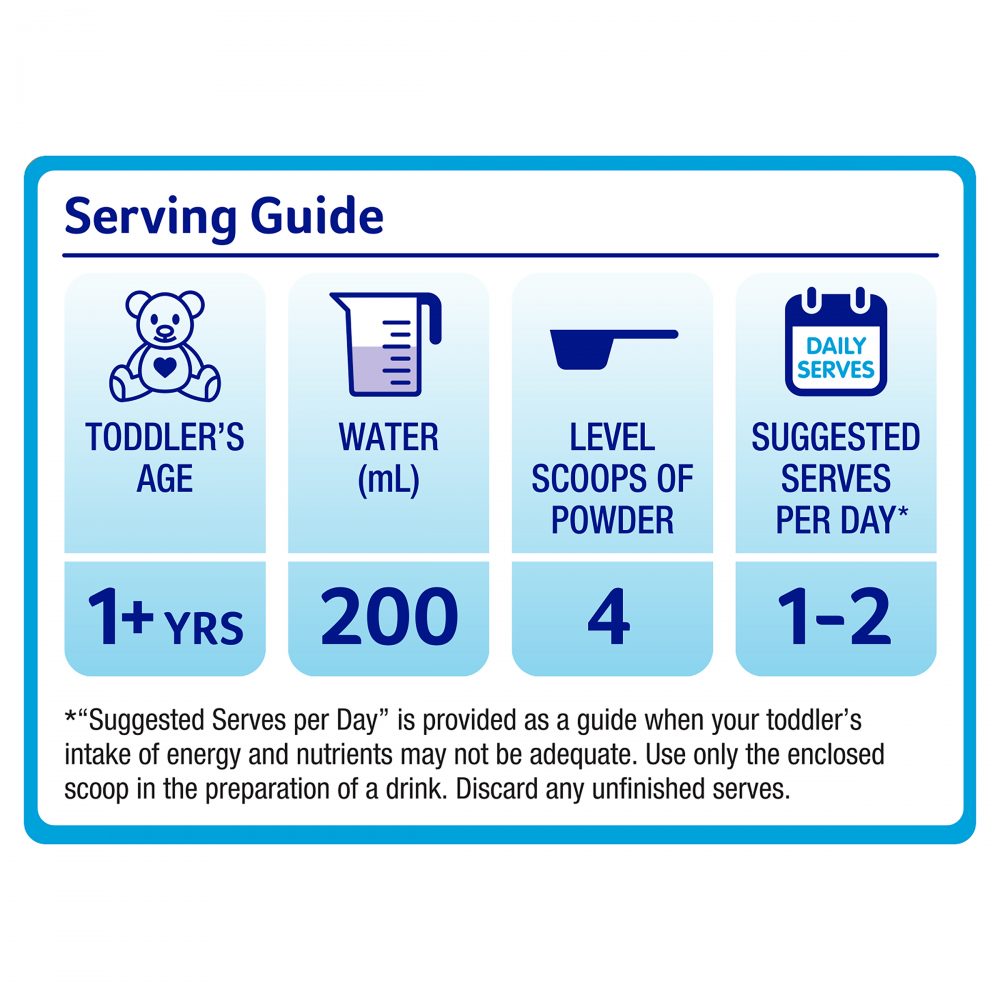 Thức ăn bổ sung theo công thức dành cho trẻ nhỏ từ 12 tháng tuổi trở lên. Khẩu phần mỗi lon: Khoảng 30Khẩu phần: Khoảng 220mL (30g + 200mL nước) Mỗi khẩu phần (220mL) Mỗi 100 mL % RDI1trên mỗi khẩu phần (1-3 tuổi) Năng lượng KJ 594 270 Đạm g 2,86 1,30 Chất béo toàn phần g 6,25 2,84 Bão hòa g 1,23 0,56 Chuyển đổi g 0,04 0,02 Không bão hòa đa g 2,46 1,12 Omega 3 toàn phần mg 403 183 DHA mg 30,1 13,7 Axit α-Linoleic(ALA) mg 372 169 Không bão hòa đơn g 2,18 0,99 Cacbohydrate g 18,5 8,42 Đường g 18,5 8,42 Lactose g 18,5 8,42 Sucrose g 0 0 Chất xơ g 0 0 Natri mg 32 15 Vitamin Vitamin A µg 105 48 35 Vitamin B1 mg 0,25 0,11 50 Vitamin B2 mg 0,40 0,18 50 Vitamin B6 mg 0,35 0,16 50 Vitamin B12 µg 0,50 0,23 50 Vitamin C mg 15 6,8 50 Vitamin D µg 1,7 0,78 34 Vitamin E mg 2,5 1,1 50 Folate µg 50 23 50 Niacin mg 2,5 1,1 50 Khoáng chất Canxi mg 240 109 34 Iốt µg 35 16 50 Sắt mg 3,0 1,4 50 Mangan mg 22 10 28 Phốt pho mg 175 80 35 Kẽm mg 1,1 0,50 25 Lutein µg 44 20