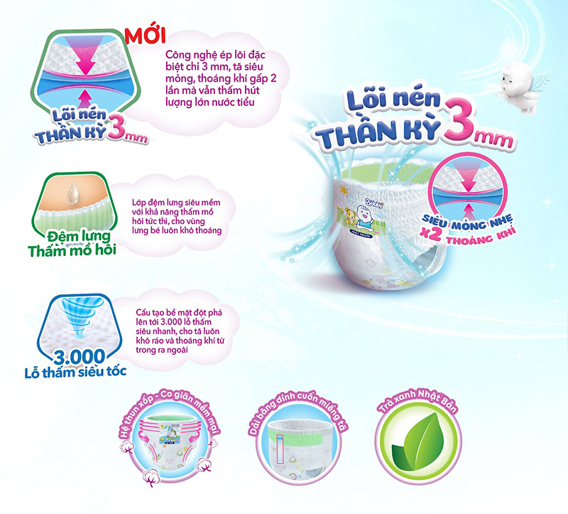 - Tinh chất trà xanh Nhật Bản được bổ sung vào bề mặt tã giúp chăm sóc và bảo vệ làn da bé.