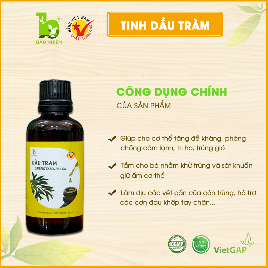 Dầu tràm Bảo Nhiên được chiết xuất từ 100% lá cây tràm Huế có nguồn gốc từ thiên nhiên với nhiều tính năng trị liệu độc đáo mà không một loài thảo dược nào có được như: sát khuẩn, giảm đau, giữ ấm cơ thể, đặc biệt thành phần α – Terpineol trong dầu tràm có tác dụng ức chế Virut cúm H5N1. Từ sự đúc kết những kinh nghiệm chưng cất dầu bằng phương pháp thủ công truyền thống quý giá của cha ông đã tồn tại nhiều năm qua, kết hợp với việc ứng dụng những phương pháp chiết khấu hiện đại để tạo nên một sản phẩm hoàn hảo có tác dụng thần kỳ trong việc chăm sóc sức khỏe cả gia đình.