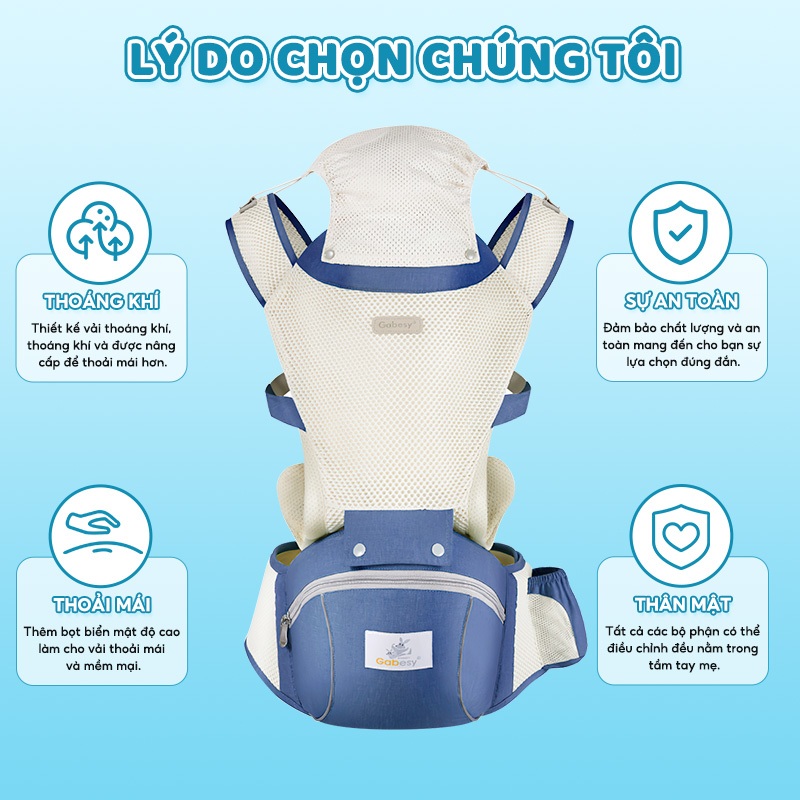 - Địu chính hãng Gabesy có trọng lượng siêu nhẹ và có bệ ngồi chịu lực, có dây đai phân bố đều lực lên cả vai và hông của bố mẹ, ba mẹ có thể đeo và sử dụng thoải mái trong thời gian dài mà không bị mỏi/đau lưng, vai.