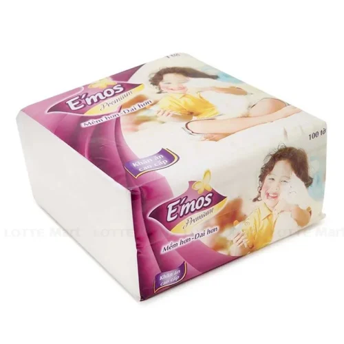 Khăn giấy từ thương hiệu khăn giấy Emos của Việt Nam. Thành phần bột giấy tự nhiên an toàn cho da. Khăn giấy ăn E’mos Premium 1 lớp gói 100 tờ thấm khô thực phẩm trước khi chiên, thấm dầu thực phẩm sau khi chiên, vệ sinh nhà bếp, lau chùi vật dụng, lau tay