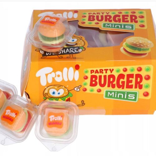 Kẹo dẻo Trolli Mini Burger là sản phẩm chủ chốt, đứng đầu và đắt hàng nhất của tập đoàn bánh kẹo Trolli nổi tiếng của Đức, chất lượng cao và an toàn cho sức khỏe. Kẹo được thiết kế dạng dẻo, dai ngon, thơm mùi của trái cây, hình chiếc bánh hamburger mini với đủ 3 tầng bánh, thịt bò, rau và sốt cà chua, vô cùng bắt mắt, hấp dẫn. Kẹo dẻo Trolli Mini Burger rất được trẻ em yêu thích mà người lớn cũng phải mê.