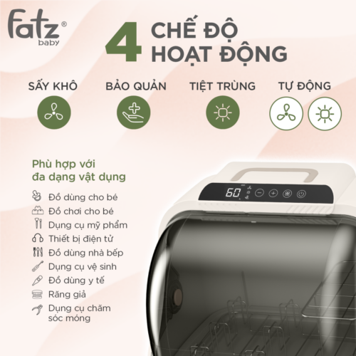 - – 4 chế độ hoạt động riêng biệt: TỰ ĐỘNG/TIỆT TRÙNG/SẤY KHÔ/ BẢO QUẢN.