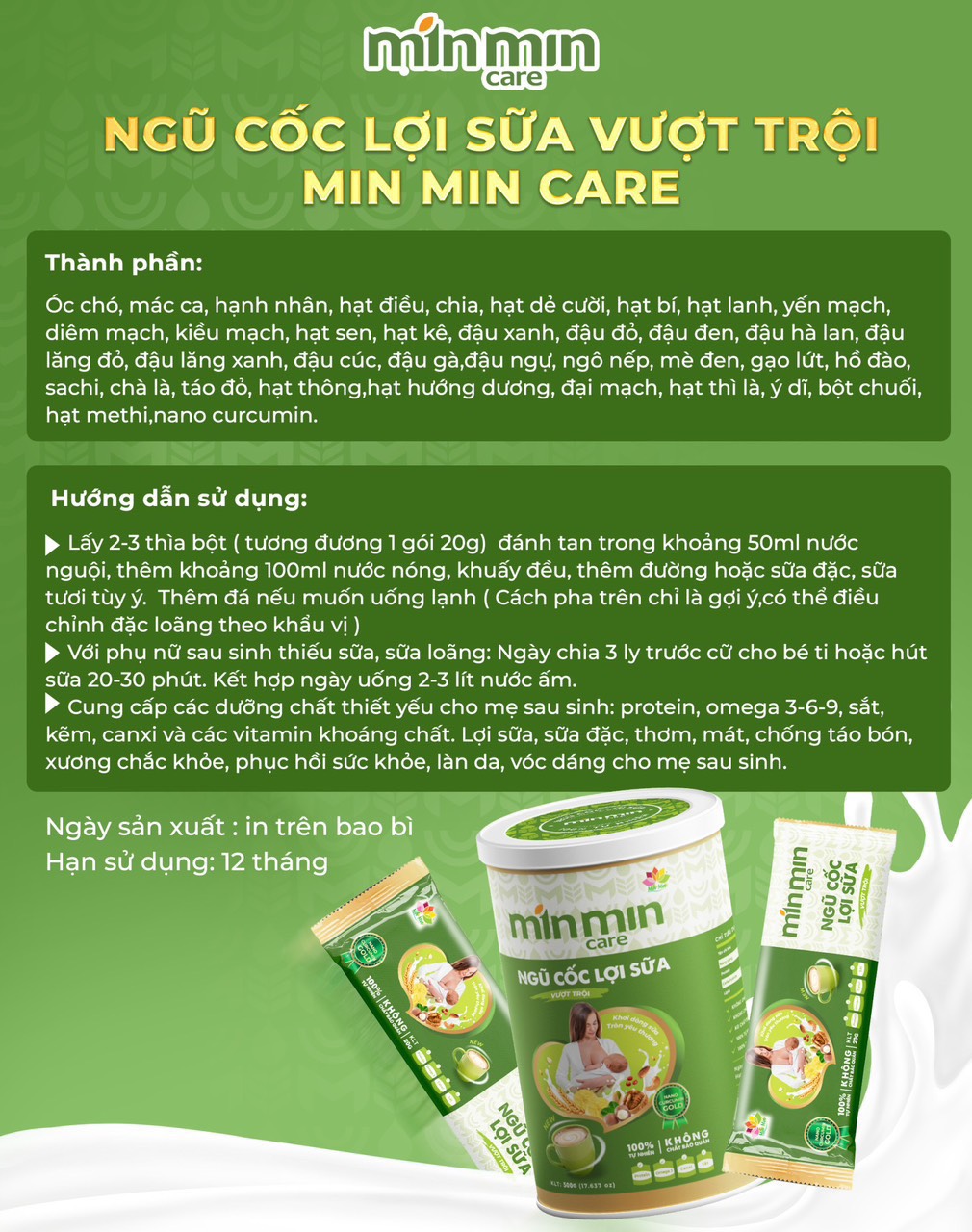 Ngũ cốc lợi sữa Min Min 38 vị hạt – Là sản phẩm giúp lợi sữa áp dụng công nghệ Nano cucurmin 95%, giúp Mẹ về nhiều sữa hơn, dinh dưỡng trong sữa cao.