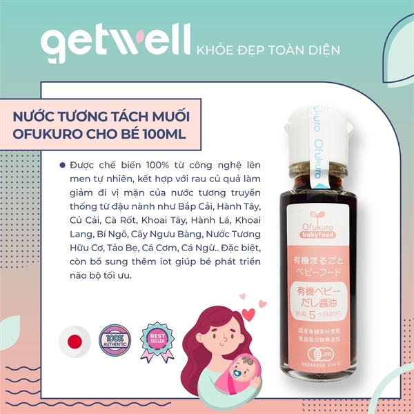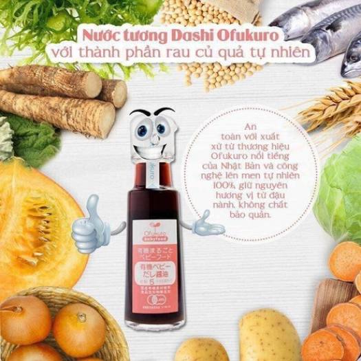 Mô tả về sản phẩm: Với trẻ nhỏ, đặc biệt là các bé trong độ tuổi ăn dặm ngoài việc lựa chọn các nguyên liệu đảm bảo cân bằng chế độ dinh dưỡng thì việc thêm các gia vị là vô cùng quan trọng. Gia vị thêm vào phải vừa giúp bổ sung muối, khoáng chất kích thích vị giác của bé lại phải đảm bảo không gây ảnh hưởng tới các chức năng gan, thận, tim của bé sau này. Nước tương Ofukuro Nhật là một trong những gia vị, thực phẩm dành cho bé, đem lại dinh dưỡng tối ưu trong thời kỳ ăn dặm, là một trong những lựa chọn hàng đầu của ba mẹ.