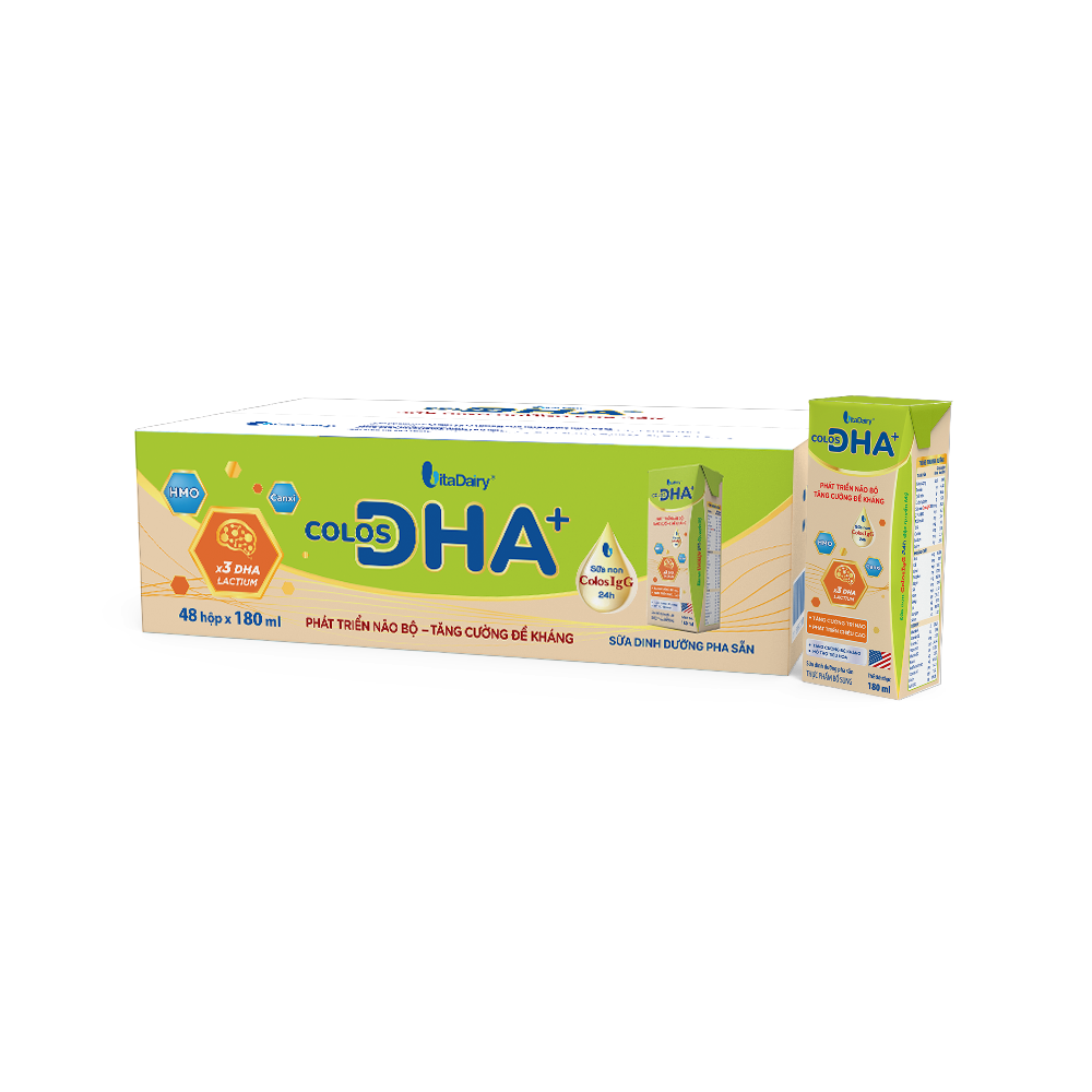 Sữa uống dinh dưỡng Colos DHA+ với công thức dinh dưỡng khoa học; Gấp 3 DHA(*) từ tảo biển và hệ dưỡng chất cao cấp tốt cho trí não; bổ sung Canxi, Sữa non ColosIgG 24h từ Mỹ và HMO giúp tăng cường trí não, phát triển chiều cao và tăng cường đề kháng với hương vị thanh mát, tự nhiên.