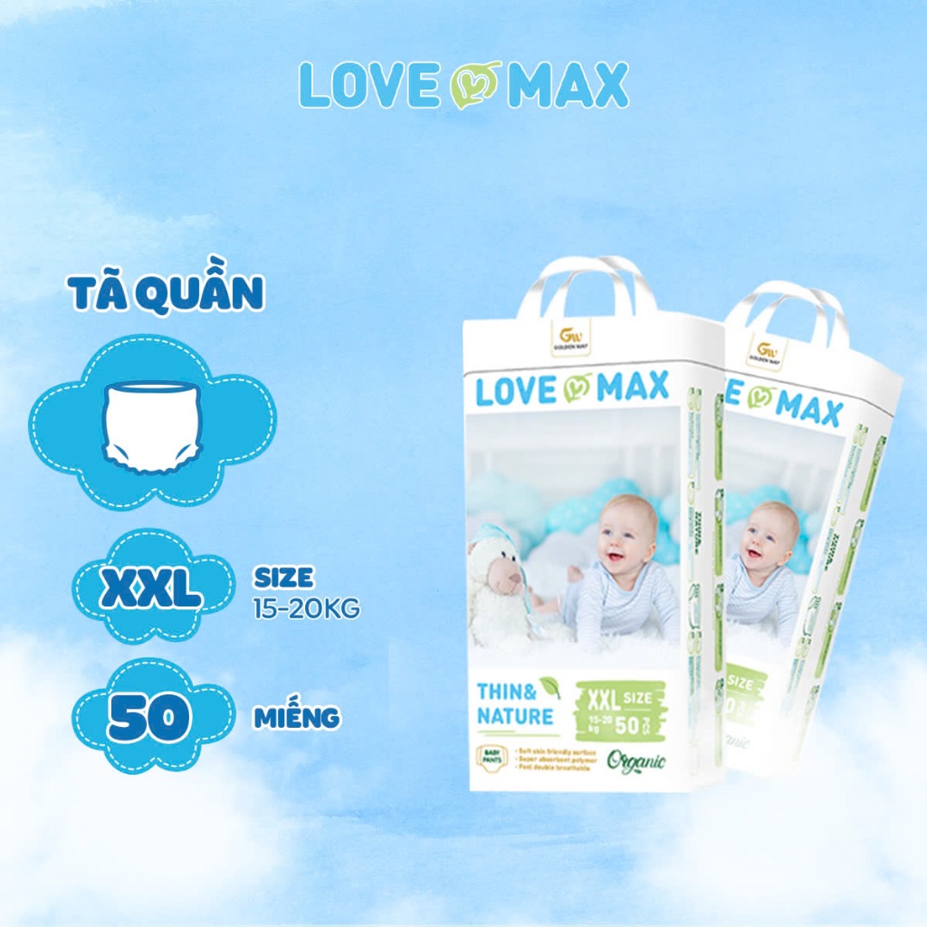 - Love Max sử dụng công nghệ đệm mây hiện đại, tạo sự mềm mại tuyệt đối bên trong đai thun, giúp bỉm luôn ôm sát cơ thể bé và nâng niu bảo vệ làn da bé.