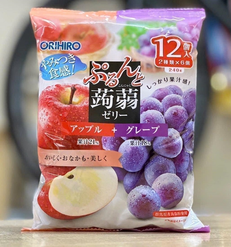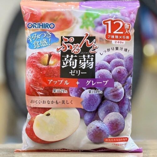 Thạch trái cây Orihiro Nhật Bản vị táo và nho tím nhờ được làm từ nước ép trái cây tươi nên thạch rất giàu các loại vitamin A, C và axit amin. Ngoài ra, sản phẩm còn được bổ sung chất konnyaku, có tác dụng kích thích hệ tiêu hóa, giúp cơ thể giảm hấp thu đường và giảm sản sinh cholesterol, rất tốt cho người huyết áp cao hoặc tiểu đường, béo phì.